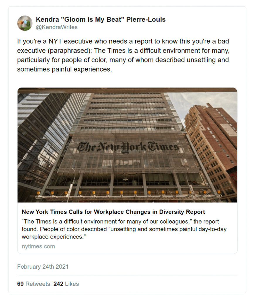 The Times has similar work to do when it comes to rebuilding a healthy work culture: This week, they released a report spearheaded by senior leaders Amber Guild, Carolyn Ryan, and Anand Venkatesan with four action items for the newsroom: transforming the newsroom culture, increasing the number of Black and Latino journalists in leadership roles by 50 percent by 2025, strengthening Human Resources practices to improve hiring and engagement processes, and diversifying editorial ranks.