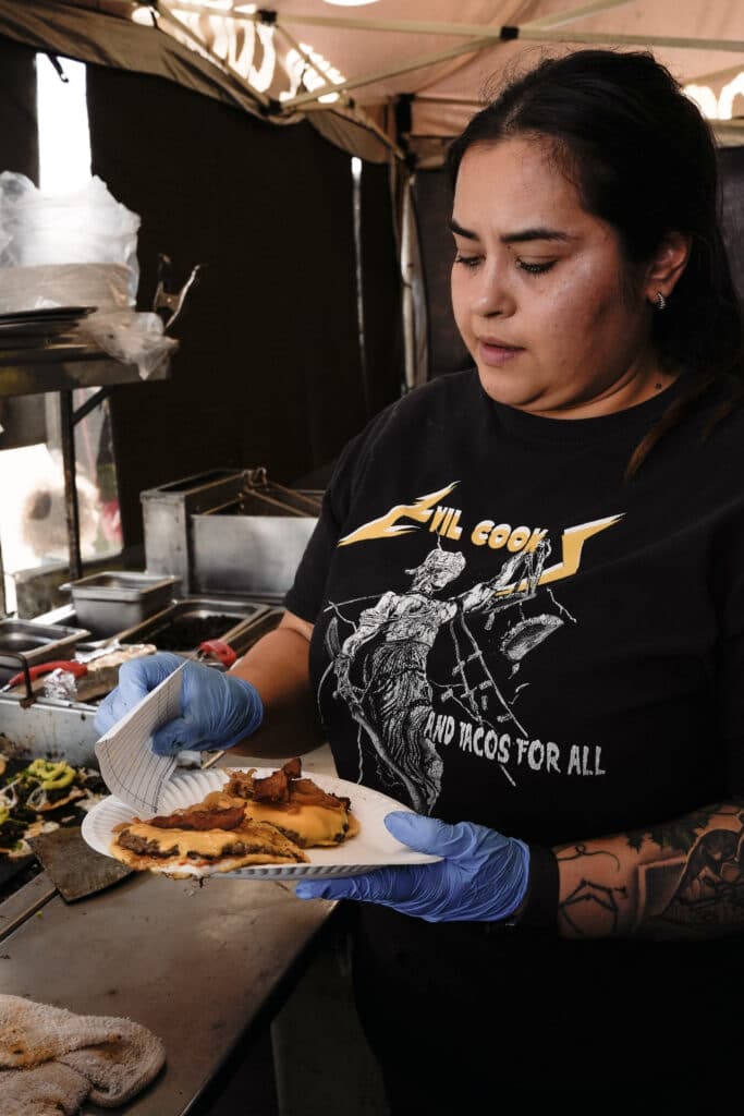 There are food vendors who are looking to elevate street food, like the popular Evil Cooks, a gothic-style taco truck based in East L.A. that has been featured in the New York Times for their unique spin on Mexican food with flavors like black pastor and El Asesino, a mix of pastor and octopus.